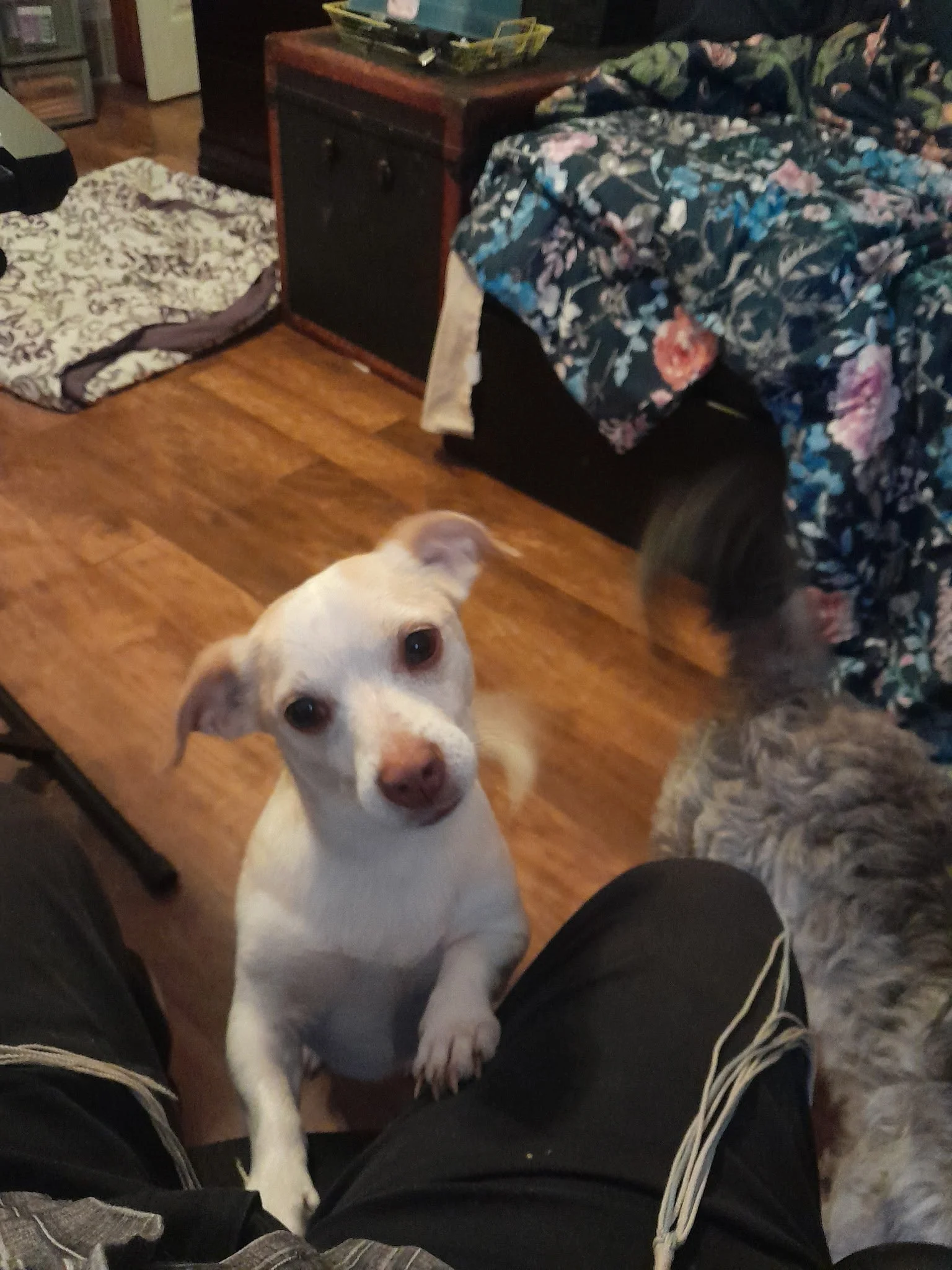 Picture 2: White, short hair, very affectionate, about 30 lbs.